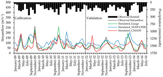 According to Table 6, CMADS had a satisfactory performance compared to NCEP-CFSR during the calibration period. The R2, NSE and RB values for CMADS are 0.60, 0.59 and −3.7%, respectively. The R2 and NSE values of NCEP-CFSR are 0.58 and 0.21, respectively, which are slightly lower than NCEP-CFSR. Interestingly, NCEP-CFSR dramatically overestimated the monthly streamflow by 40%, indicating NCEP-CFSR overestimated the precipitation amount in this basin. During the validation period, CMADS outperformed NCEP-CFSR in monthly streamflow simulation, with the R2, NSE and RB values of 0.39, 0.21 and −13.1%, respectively. By contrast, the performance of NCEP-CFSR is considered as unacceptable for the validation period due to the negative NSE (−0.23) and extremely high RB (44.7%) values. A similar finding has been reported by Tan [17] where NCEP-CFSR also performed poorly in another two Malaysian river basins, called Kelantan River Basin and Johor River Basin. Therefore, Tan [17] suggested to use a combination of Asian Precipitation—Highly-Resolved Observational Data Integration towards Evaluation (APHRODITE) precipitation and NCEP-CFSR temperature data for SWAT modelling in Malaysia.