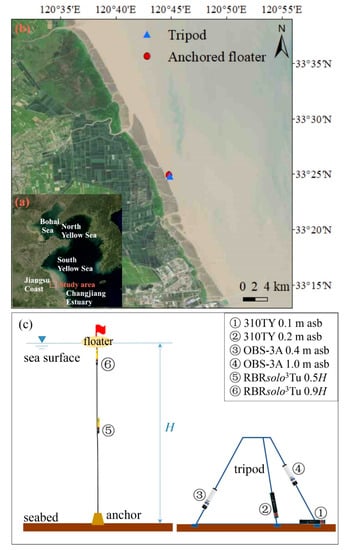 The middle of the Jiangsu coast, China, is characterized by high SSC (>1 kg/m3) [14], which makes it an excellent area to study the effectiveness, feasibility, and prospect of the above three types of optical turbidimeters in the in situ measurement of SSC of high-turbidity waters. A tripod was set on the inner shelf of the Dafeng Harbor on the middle of the Jiangsu coast during 12–14 November 2019 (Figure 1). The mean water depth of the observation site was around 7 m. Two 310TYs (0.1 and 0.2 m above the seabed (asb)) and two OBS-3As (0.4 and 1.0 m asb) were mounted on the tripod. A floater was anchored very close to the tripod, and two RBRsolo3Tu turbidimeters were deployed at the middle (0.5H, H denotes the water depth) and near-surface (0.9H) of the water column. These six instruments were all set to have a sampling frequency of 1 Hz, measuring for 30 s in each sampling interval of 3 min.