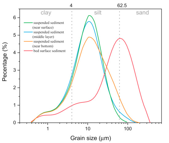 The grain-size distributions of the suspended sediments in the three sub-samples taken from the middle water column show few discrepancies and thus one of them was selected as a representative. D50 of the suspended sediment was 9.3 μm, and clay (<4 μm), silt (4~62.5 μm), and sand (>62.5 μm) contents were 18.6%, 79.3%, and 2.1%, respectively, revealing the attributes of cohesive sediments [19]. Besides this, D50 of the near-surface and near-bottom samples of suspended sediment was 9.4 μm and 11.1 μm. Clay, silt, and sand contents were 18.0%, 81.5%, and 0.5% for the near-surface sample and 16.7%, 78.9%, and 4.4% for the near-bottom sample. Thus, the grain-size distribution of the suspended sediment varied a little throughout the water column. The surface bed sediment was much coarser than the suspended sediment (Figure 2), the samples having a D50 of 45.4 μm and contents of clay, silt, and sand of 10.0%, 49.8%, and 40.2%, respectively.