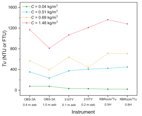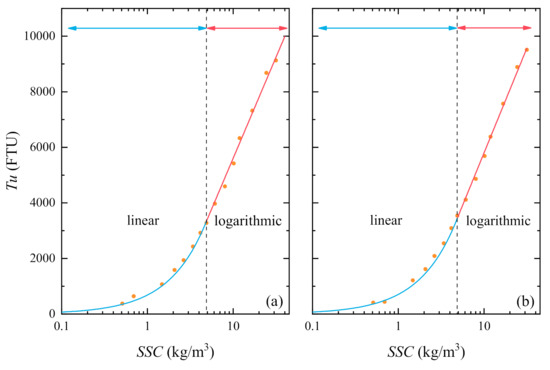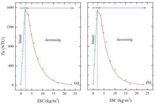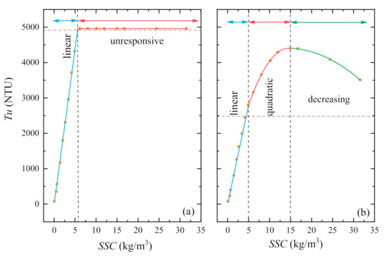 Optical turbidimeters measure water turbidity, which is thereafter calibrated with SSC, and in this way, the in situ SSC can be observed. The calibrated relationship between water turbidity and SSC is thus pivotal in the application of optical turbidimeters [6]. Within certain ranges, turbidity (Tu) increases monotonically with the increase in SSC and can be converted to SSC accurately according to the monotonic functions. However, the calibration relationships between Tu and SSC can be different using different optical turbidimeters. Besides this, under high SSCs (>1 kg/m3), Tu responds to SSC more intricately, and the response curves may not be monotonous, which gives rise to difficulties in the conversion from Tu to SSC [10,11].