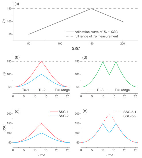 Firstly, a calibration curve of Tu~SSC conversion is assumed as in Figure 6a. For turbidities from a small value to the maximum of the measuring range (i.e., the inflection point), the curvilinear sections showing positive responses of turbidity to SSC are applicable with no doubt. However, multi-solution is inevitable if the output of turbidity decreases after reaching the full range of measurements. This is likely due to the decrease or increase in SSC. The latter is associated with the turbidity increasing again to the full range after a high SSC event. Therefore, if only one peak exists in the time series of turbidity (Figure 6b), the curves can be applied with a positive response of turbidity to SSC (Figure 6c). Otherwise, if multiple peaks reach the full range of turbidity (Figure 6d), it is difficult to determine that SSC firstly increases and then decreases between two peaks or decreases first and then increases (Figure 6e).