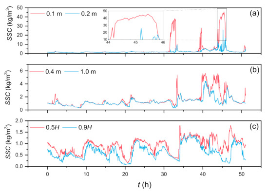 According to the above principles, the time series of turbidity at a variety of depths observed from the middle of the Jiangsu coast can be converted to those of SSC (Figure 7). Because the turbidity measured by 310TY monotonically responds to SSC (Figure 4) and only a peak occurs in the time series of turbidity at 0.1 and 0.2 m asb, these turbidities can be converted to SSC using Equations (6)–(9). Figure 7a reveals that three fluid-mud events take place near the seabed (t = 31.55~33.05 h, 39.45~39.7 h, and 43.8~45.85 h), during which the thickness of fluid-mud is larger than 10 cm and SSC > 10 kg/m3 [16].