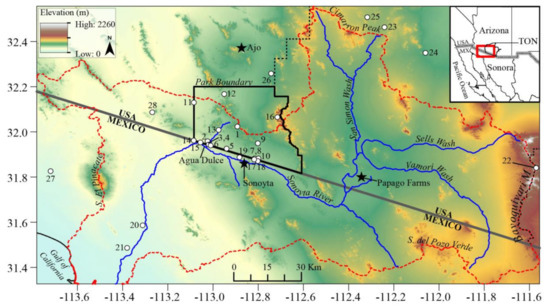 Sonoyta River Watershed (delimited by red-dotted line) and major geographical features in the region. Black dashed line shows the limits of the Tohono O’odham Nation (TON). Black bold line shows the limit of the Organ Pipe Cactus National Monument (OPCNM). Sample sites (white circles) are identified by numbers listed in Table 1. Black star symbols show the towns of Ajo, Arizona, Sonoyta, Sonora, and the Papago Farms in the TON.
