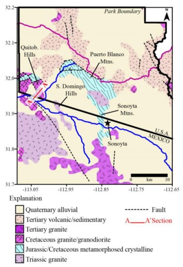 The Basin-and-Range Province of western North America is characterized by horst and graben physiography consisting of long, narrow mountain ranges separated by alluvium-filled valleys supporting regional groundwater aquifer systems. The geology and hydrogeology of the OPCNM, including the Sonoyta Valley, La Abra Plain, and surrounding areas, have been described in previous studies [30,31,32]. Principal geological units are shown in Figure 4. The study area is bounded to the north and northwest by mountain ranges consisting of Mesozoic igneous and metamorphic rocks exposed by late Cretaceous thrust faulting and tectonic sliding (e.g., Quitobaquito Hills, Puerto Blanco Mountains; [30]). Granite gneiss, schist, granite, and metasedimentary rocks are the main lithological components [31]. To the northeast, the study area is bounded by igneous rocks of late Cretaceous and Tertiary age, include andesite, rhyolite, latite, and granodiorite complexes in the Ajo Range [33].
