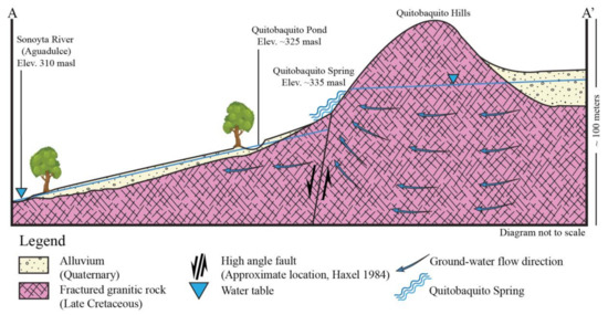 Cross-section of the Quitobaquito Springs area. See Figure 4 for cross-section trace location. Modified from [34].