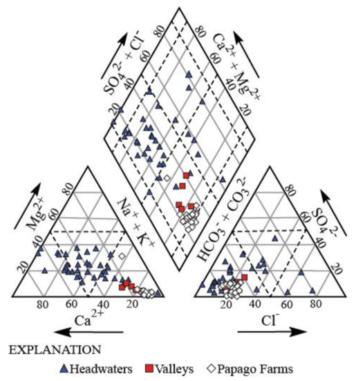 Piper Diagram showing data for groundwater samples along the Sonoyta River course. “Headwater” samples were collected near the Baboquivari Mountains, “Valleys” samples were collected along the floodplains downstream, and “Papago Farms” samples were collected within the irrigated fields of the Tohono O’odham Nation (see Figure 1 for location). Data from Water Quality Portal [42].
