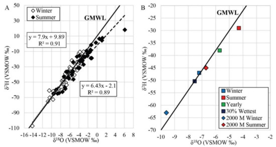 - Smith, G.I.; Friedman, I.; Veronda, G.; Johnson, C.A. Stable isotope compositions of waters in the Great Basin, United States, 3, Comparison of groundwaters with modern precipitation. J. Geophys. Res. 2002, 107, 4402. [Google Scholar] [CrossRef]