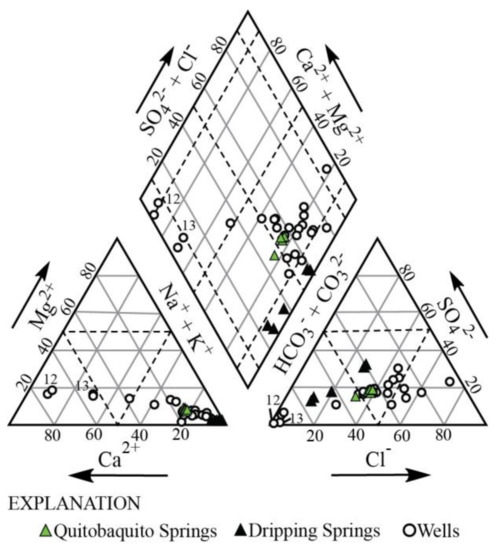 The chemical character of groundwaters depends on the location. Recharge areas tend to be dominated by Ca-HCO3 water types and low concentrations of total dissolved solids. Down gradient areas in alluvial basins tend to be dominated by Na-HCO3-Cl water types (see Figure 6; [40]). SO42− to Cl− ratios were used in the nearby San Pedro River, in southeastern Arizona, to differentiate basin groundwater from monsoon flood recharge sustaining intermittent streamflow [41].