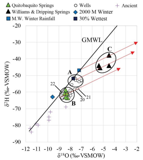 δ18O and δ2H values for mean rainfall (winter, and other values shown in Figure 7B), springs, and wells. Red arrows show the expected evaporation trend in the area with a slope of 3.16 obtained from Figure 8. Quitobaquito samples (from spring and pond) are shown by green-filled triangles in Group B. Ancient water samples (uncorrected pMC < 10) in southern Arizona from [2]. Wells east (upstream) of Quitobaquito along the Sonoyta River floodplain (7, 8, 10, 17, 18, 19) have (δ18O, δ2H) ranges between −8.7 and −8.0‰ and −64.1 and −60‰ respectively.