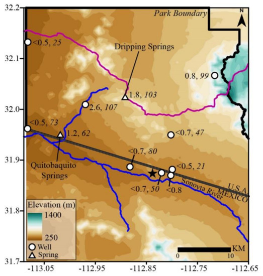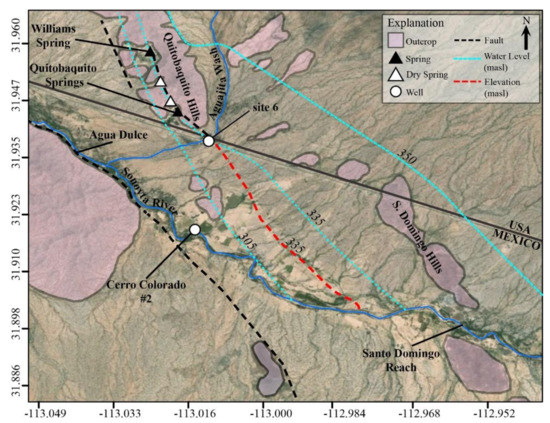 A hydraulic connection between the local groundwater at Quitobaquito and the regional groundwater beneath the Sonoyta River is plausible [34]. The fault zone from which the springs discharge (~335 masl) may extend southeast to the Sonoyta River on the indication of vegetation anomalies observed in satellite images, and the presence of a former perennial reach south of the Santo Domingo Hills [2]. This hypothetical fault would closely follow the 335 m contour in Figure 12 (red-dotted line).
