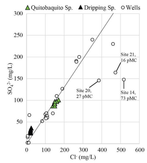 Samples 20 and 21 plot outside groups A and B (Figure 10). However, these two samples are slightly different in terms of Cl− and SO42−, and 14C. The concentrations for both anions are higher in these two samples than in most of the samples in groups A and B (Figure 13) and 14C pMC are the lowest among all samples (16 and 27 pMC). At a first glance, these samples can be interpreted as analogous to Group B but evaporated prior to recharge. Both samples are located in the southernmost locations along the Sonoyta River and were obtained from wells near irrigated lands (Figure 1). The high degree of evaporation could reflect irrigation reflux into the aquifer, although the low 3H and 14C pMC values do not suggest recent exposure to the atmosphere.