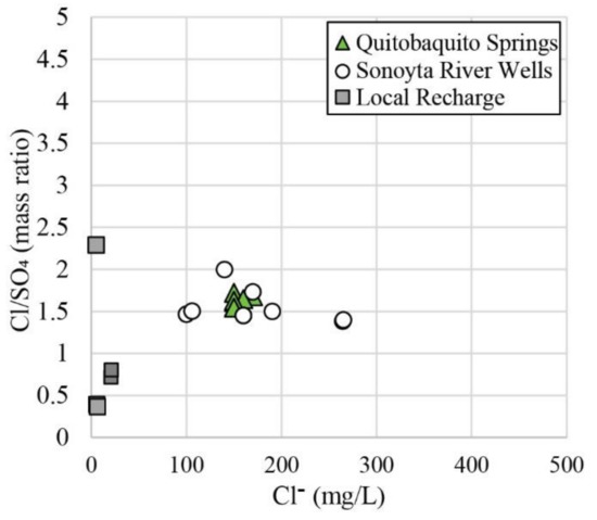 A southeast continuation of the fault could intersect the river where the 335 m topographic contour (red-dotted line in Figure 12) crosses the channel. When the river had perennial water in the past, perhaps during cooler and wetter times or prior to major irrigation development, it would have been capable of supplying water to the suggested fault zone, and into Quitobaquito. Upward flow in the fault zone at Quitobaquito may be driven by regional hydraulic gradients. The SO42− and Cl− concentrations at Quitobaquito are higher than those of local recharge and more similar to those of Sonoyta River waters (Figure 13). Similarly, the mass ratio of Cl/SO4 at Quitobaquito and Sonoyta River water plot close to each other suggesting a common origin (Figure 14).