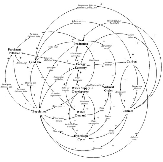 The highly endogenous structure and coupling of sub-systems in the ANEMI3 model are part of its novelty in the realm of integrated assessment modelling. Because of this, feedback processes are responsible for the behavior that is exhibited in model runs. The model sectors that comprise the ANEMI3 model are that of the climate system, carbon, nutrient and hydrologic cycles, population dynamics, land use, food production, sea level rise, energy production, global economy, persistent pollution, water demand and water supply development as shown in Figure 1. The model includes over 2000 variables and 700 equations. Presentation in Figure 1 is focused on illustrating the high-level model sectoral structure and relationships. Feedback loops between sectors or intersectoral feedback loops are responsible for global change in this Earth system. Intersectoral feedbacks in the ANEMI3 model allow for the representation of various aspects of global change. In the Figure 1 diagram alone there is a total of 89 possible intersectoral feedback loops. The size of the feedback loops range from 2 to 9 sectors included out of the 10 that are shown. An example is that of a growing global economy, which drives energy production and industrial growth, thereby resulting in more greenhouse gas emissions and climate change. This in turn results in negative feedbacks on economic growth through climate damages, which can represent economic damages because of land and structures lost to coastal flooding, for example. Creating a causal loop diagram from these connections between model sectors allows us to view the feedbacks that are created by combining model sectors in this way.