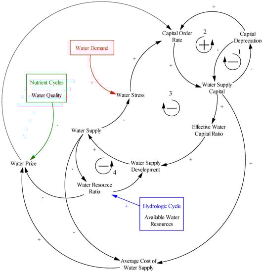 Causal loop diagram of the ANEMI3 water supply development sector. The dotted arrow from water price to water supply indicates a causality that is neither positive nor negative. Different colors identify inputs coming from different model sectors. Clockwise arrow with − sign designates negative feedback loop and counter clockwise arrow with + sign designates positive feedback loop.