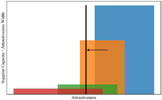 Where denotes the type of water supply for which desired water capital is being determined. In order to obtain the demand for water supply from each source, Wood’s algorithm [] is used to allocate the total water demand (sum of domestic, industrial and agricultural water demand) to each supplier. The geometric illustration of Wood’s algorithm is shown in Figure 3, where each rectangle represents a different supplier (blue-surface, orange-ground, green-wastewater reclamation and red-desalination water supplies). The area of each rectangle represents the capacity for a given supplier to fulfil the demand for a product, while the position and width of each rectangle is based on the “attractiveness” value and “width” parameters respectively. Here, the inverse water supply price is used to represent the attractiveness value and the area of each rectangle would be the water supply capacity for a given supply type. The total water demand is allocated to each supplier by the black line in Figure 3 which moves from right to left until the area to the right of the line fulfils the demand. The area of each rectangle that lies on the right of the black line represents the level of demand satisfied by each supplier, therefore a water supply type with a high price would be placed farther to the left on the attractiveness scale and would receive less of the total water demand.