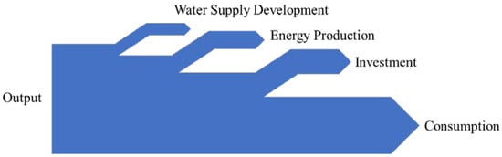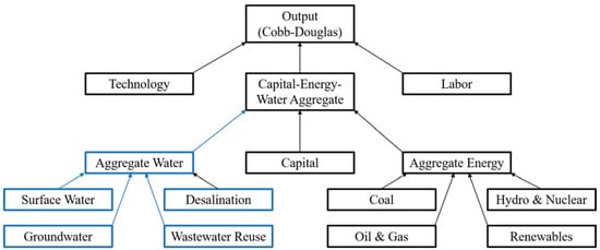 The new water supply sector in ANEMI3 was developed by incorporating water supply as a new production sector within the newly added energy-economy sector [,,]. This has been achieved by adding capital stocks to produce water supply in the form of surface, ground, wastewater reclamation and desalination water sources.