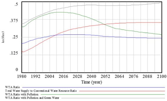 As the simulation progresses, water stress with only pollution effects considered (Equation (10)) on top of the WTA reaches a peak in the year 2010 and declines afterwards. This is because in this case the pollution effects are represented only through wastewater inputs, which decrease as domestic and industrial water demands decrease in the model due to reduced water intensities with greater global economic output. When water pollution in the form of agricultural runoff or green water is included, water stress values continue to rise to a value of 0.5 by the end of the simulation. This indicates severe levels of water stress. Using the ratio of water supply to available water resource levels as an indicator of water stress results in a starting value of 0.15 which follows S-shaped growth to 0.35. This indicates a shift from low levels of water stress to the high end of the medium-high water stress category.