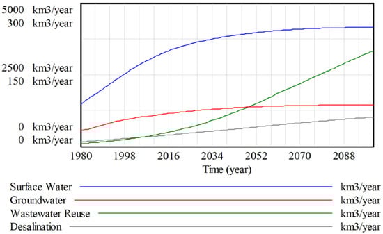 The amount of water resources available for the development of water supplies is dependent on the hydrologic cycle, water demand and water quality sectors of the model. In the case of surface water, the stable and reusable portion of runoff is taken from the total renewable streamflow and is adjusted for untreated wastewater discharge. The adjustment for wastewater discharge is based on [] which estimates that for every cubic meter of contaminated wastewater discharged into water bodies and streams, makes unsuitable 8–10 cubic meters of fresh water. The difference in groundwater percolation and discharge is used for the consideration of groundwater resources as this refers to renewable groundwater. Only renewable groundwater resources are considered for the global scale. The inclusion of non-renewable or fossil groundwater resources should be considered at the regional scale. For the potential reuse of wastewater, industrial and domestic wastewaters are considered. Although the reuse of wastewater is highly dependent on the type of wastewater and the use for which it is being treated, it is considered here as a supplementary type of water supply in the case of groundwater and surface water depletion. Water resources used for desalination are considered primarily from the ocean stock in the hydrologic cycle. This results in a virtually limitless supply; however, it is very energy intensive resulting in a high effective input intensity thereby limiting production.