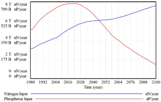 Total nitrogen and phosphorus input to surface water under the ANEMI3 baseline scenario. Left axis represents number of moles of nitrogen and phosphorus inputs to surface water per year.