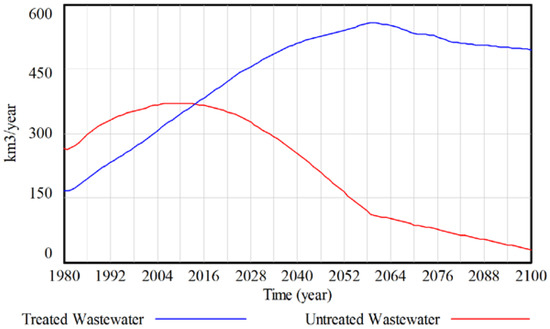 The explanation for the difference in the pattern of nitrogen and phosphorus inputs lies in their respective amounts in different sources. For nitrogen, on a global scale, agriculture is the main anthropogenic source of nutrients to surface waters, while domestic and industrial wastewaters are the main source of phosphorus. Phosphorus input decreases after the year 2025 due to increasing levels of wastewater treatment on a global scale, which reduces the input significantly. The levels of treated and untreated wastewater are shown in Figure 9. Initially, the amount of untreated wastewater is greater than treated on a global scale in 1980. Under the ANEMI3 baseline scenario, wastewater treatment increases from the initial rate of 160 km3/year and surpasses that of the untreated percentages in 2010. After this point, treatment rate increases further to approximately 550 km3/year.