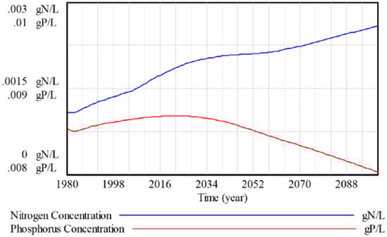 Nutrient inputs act as an additional rate that affects the surface water stock in the nutrient cycle model. Combining this with the stock of surface water in the hydrologic cycle model allows for the concentrations of nutrients in surface water on a global scale to be examined, as shown in Figure 10. The concentration considers changes in hydrologic cycle. The patterns are almost the same because the global amount of streamflow does not change very much due to climate change increase and surface water consumption having a balancing effect in the ANEMI3 baseline scenario.