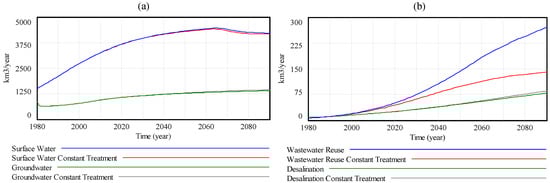 Development of water supplies under the baseline and constant wastewater treatment scenarios for (a) conventional water supplies and (b) alternative water supplies.