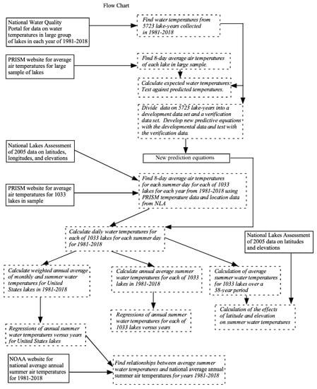 We extracted water temperature data on lakes (natural and manmade) from the United States Geological Survey’s (USGS’s) Water Quality Portal (https://www.waterqualitydata.us/), which aggregates access to multiple databases, including the USEPA’s Storage and Retrieval Data Warehouse (STORET) and the USGS National Water Information System (NWIS). We filtered the data to obtain water temperatures measured at 1 m depth in the months of June through September. The obtained water temperatures were measured by a variety of government agencies and universities and we assumed them to be accurate. However, in many cases, stringent quality control programs like those of the USEPA’s NLA were not associated with the measurements. Our search also provided the geographic coordinates of each of the selected lakes. Ultimately, we obtained from 49 to 207 lake water measurements for each year in the 1981–2018 period with an average of 133 lakes per year. Data were obtained for lakes in 36 states as not all states contributed data to the Water Quality Portal. Most measurements came from lakes in Minnesota, Michigan, Wisconsin, North Carolina, and Vermont. Because most of the sampled lakes were from low elevations, we added data from several lakes with elevations greater than 500 m that were collected as a part of the NLA [20,22]. Our final dataset included 5078 lake temperature measurements from the Water Quality Portal and 645 lake temperature measurements from the NLA for a total of 5723 samples in the period 1981–2018. In some cases, temperature measurements were obtained from the same lake for 1 to 4 months in the same year or for more than one year. A flow chart of the data sets and analyses used in this study is presented in Figure 1. Mean air temperatures at each lake for the day of sampling and for each of the preceding seven days were obtained from the website of the PRISM Climate Group, Oregon State University (http://prism.oregonstate.edu, created 23 May 2019). Their website allows one to obtain mean daily air temperatures, other meteorological data, and lake elevations based on a grid of 30-arcseconds of latitude and longitude. The cells are about 900 m × 700 m in size [23]. We tested the four predictive models developed by Bachmann et al. [16] on the 5723 lake temperature samples collected in this study to calculate estimated water temperatures for each of the samples. The measured water temperatures at each lake were subtracted from the calculated water temperatures to evaluate how well the models developed by Bachmann et al. [16] could hindcast past temperatures. Regressions were run of the differences between calculated and measured values versus the year of sampling.