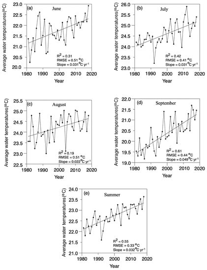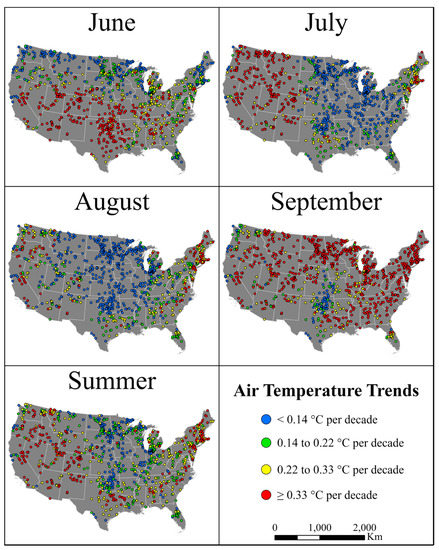 For the four-month summer period, the warming rate was 0.32 °C decade−1. The fastest warming rate was for the month of September with 0.49 °C decade−1 followed by the months of June and July both with rates of 0.31 °C decade−1, and August (0.22 °C decade−1). We also calculated our results for different combinations of three or two months for comparisons with the results of other studies (Table 1).