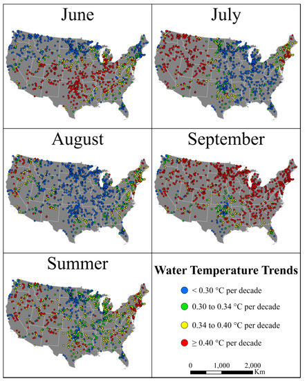 When looking at water temperature averages for United States lakes, we found September was the fastest-warming month with a warming rate of 0.49 °C decade−1. Water temperatures in June and July warmed at rates of 0.31 °C decade−1, while the August average rate was the slowest at 0.22 °C decade−1. Other lake temperature studies focused on Wisconsin also found that for most of the Wisconsin lakes they studied, the maximum heating rates were found in the fall months and resulted in a delay in fall cooling [30,31]. Higher rates of warming in lakes in the fall season could be contributing to delayed dates of ice formation in north temperate lakes [32]. However, we also found a high degree of variability in warming rates among lakes with monthly coefficients of variation ranging from 22% to 46%, such that some individual lakes showed no or negative rates of temperature change.