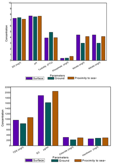 The climate of the study province (Sindh) remains predominately arid with very low rainfall averaging <200 mm annually, resulting in minimum variation in water quality parameters. In this region, the natural process such as ion exchange processes in aquifer and solubility of rocks has contributed considerably to increasing EC and TDS values [43], which were noticed in our study samples (Table 4 and Table 5). Comparatively, the increase in TDS and EC concentration in surface water source rather than groundwater indicates industrial and residential wastewater contamination which possibly mixes into surface water [7,35]. The excessive TDS effect on drinking water taste may lead to unwanted gastrointestinal irritation and physiological reaction. Previous studies in this area have also confirmed high EC and TDS [44,45,46], which raises serious concerns regarding the health of children in primary schools of Sindh province.