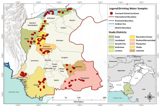 Schools are an important setting to study as children spend a significant amount of time in school settings and thus consume much of their daily intake of water from school water sources. However, there is a lack of information regarding drinking water quality in schools. Thus, the goal of this study is to systematically assess drinking water quality in the schools of Sindh providence, Pakistan. We focused on Sindh province as other studies have found poor water quality in community water sources, and poorer school performance as compared to the rest of the country [6,13].