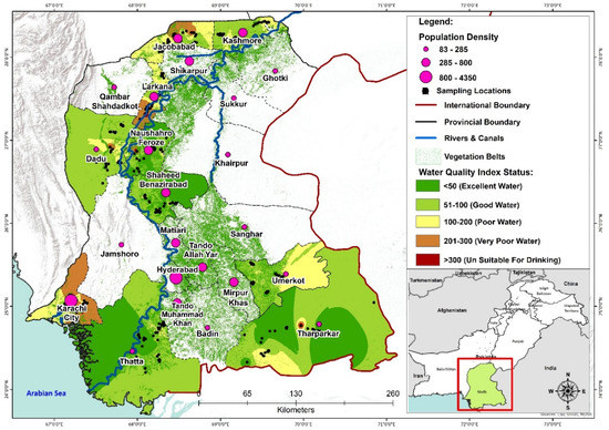 The WQI values for each sampling location were determined using weight values assigned according to their relative importance for drinking purposes to each water quality parameter (Table 2). The drinking water quality was categorized into five categories based on WQI values [33,34], as shown in Table 3. This method is considered the simplest method aimed to give a single value in grading water quality by using a list of parameters and their concentration in a single value. This single value provides a wide understanding of the water quality and its consumption (suitability) for different purposes such as irrigation, industrial, and drinking [41,46,49]. ArcGIS version 10.2 software was employed to present the spatial distribution of schools in the Sindh province and their WQI status was graded into five colors, as shown in Figure 4.