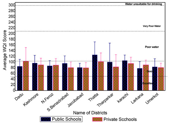 Overall, 74% of primary schools have access to excellent or good quality drinking water compared to 26% of schools with access to either poor, very poor, or unsuitable drinking water. However, there was no significant difference observed between private and public schools (Figure 6). Previous local studies revealed that the drinking water at some locations in Sindh Province is not fit for drinking [7,40,50]. Other studies have found variable results. A study of groundwater in Iran found that 52% of consumers had excellent or good quality of drinking water, while 48% of the population consume poor to unsuitable drinking water [17]. A study in south India found that water quality varied from Excellent to Poor, with significant seasonal variation due to weather (temperature and rainy season) and pilgrims, who brought enormous pressure on the basic requirement fulfillments like shelter, food, and waste disposal [19]. A similar study of surface water sources used for drinking showed that the majority of the samples at upstream locations were of excellent quality for drinking compared to poor quality at downstream locations, demonstrating the significant impact of diffuse and point sources of pollutants in these regions [38]. The results of these three studies vary compared to our study, mainly due to their focus on single water source (surface or groundwater), difference in WQI methodology, climatic conditions and variation in the source of pollutants, i.e., agriculture pesticide vs. industrial effluent.