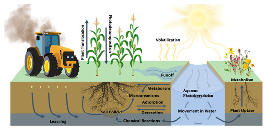 In the terrestrial environment, soil acts as a sink for most insecticides in both agricultural and urban landscapes [28]. Neonicotinoids enter soil by numerous routes including direct application to the soil through spray drift, seed dressing, and runoff. Once neonicotinoids enter the soil–water environment, they undergo various transport and transformation processes (Figure 1) [28]. Transport processes of neonicotinoids in soil environments include predominately leaching, surface runoff, and plant uptake. Fate and transport pathways of neonicotinoids in soil environments are dependent on the insecticide chemical properties (solubility, leaching potential, volatility, and half-life), soil characteristics (type, texture and formation), and application methods (seed dressing and spraying) [29,30]. Neonicotinoids that remain in the soil–water environment undergo biological and photochemical degradation [31].