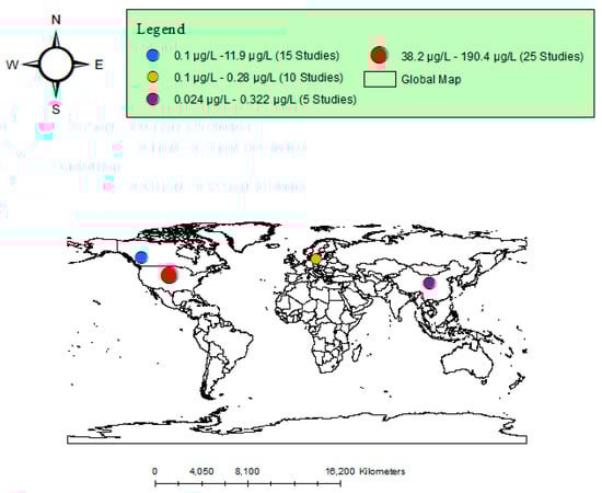 For this review, 55 studies were reviewed from eight countries around the world to investigate the occurrence of neonicotinoids in streams, groundwater, and lakes, with most studies focusing on neonicotinoid occurrence in rivers [2,5,8,22,23,51,52,53,54,55,56] (Figure 4).