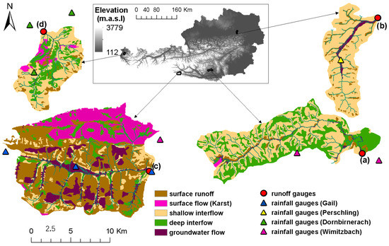 Locations and geological classes of the four catchments presented in this study: (a) Wimitzbach, (b) Perschling, (c) Gail, and (d) Dornbirnerach [4]. Streamflow lines are presented as green lines in each catchment. The runoff gauges are shown with circle points, while the rainfall gauges with triangle points.