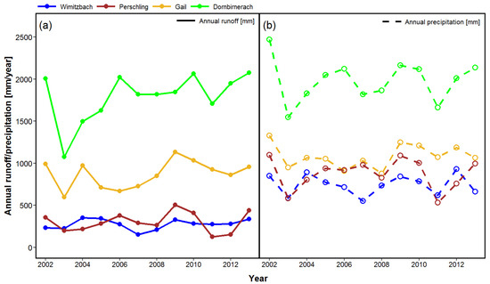 Inter-annual dynamics of mean annual precipitation (a) and runoff (b) in four Austrian catchments in the period 2002–2013.