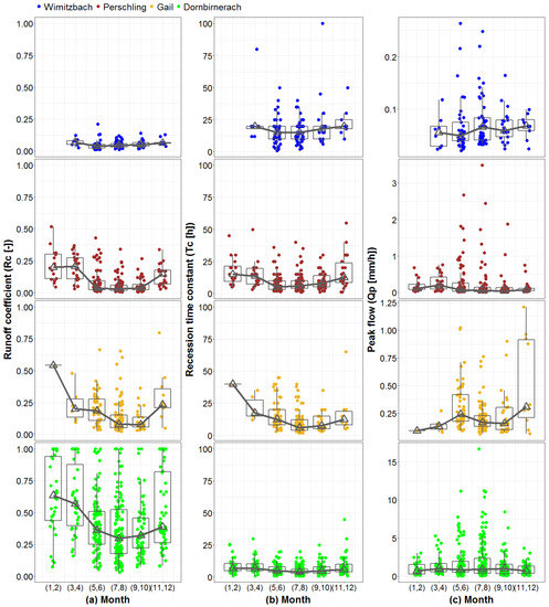 The seasonal distribution of event runoff coefficient (Rc), recession time constant (Tc), and event peak (Qp) for the four study catchments is presented in Figure 3. The variability in Rc indicates a clear seasonal pattern with larger Rc in winter and spring and smaller Rc in the summer. The seasonal variability of Rc is the highest in Dornbirnerach and the smallest in Wimitzbach catchment. Interestingly, the seasonal variability of Tc is the smallest in Dornbirnerach. More pronounced seasonal patterns of Tc are observed in Perschling and Gail catchments. The Gail catchment with 51% area generated runoff in Karst has the highest median Tc (40 h) in January/February and the lowest (6 h) in July/August. Such difference is likely connected to the seasonal catchment storage variation as discussed by Chen et al. and Patnaik et al. [5,37]. The largest event peaks are observed in all catchments in the summer months, and the smallest peaks tend to occur in winter. The seasonal variability of Qp is the largest in Dorbirnerach (it ranges from 0.7 to 1.0 mm/h), where the most extreme events with Qp larger than 2 mm/h, usually occur from May to August.