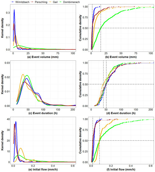 Kernel density (a,c,e) and cumulative density (b,d,f) functions of event volume, duration, and initial flow (prior to the runoff event) in four selected catchments: Wimitzbach, Perschling, Gail, and Dornbirnerach.