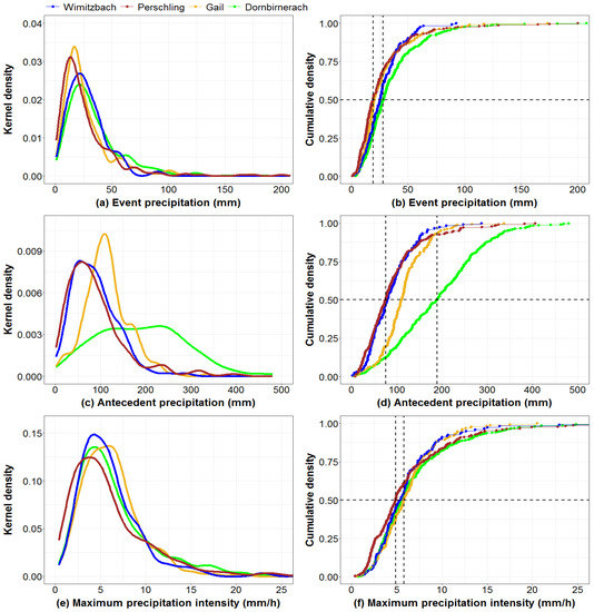Kernel density (a,c,e) and cumulative density (b,d,f) functions of total precipitation volume during runoff event, maximum precipitation intensity, and 30-days antecedent precipitation volume (prior to the runoff event) in four selected catchments: Wimitzbach, Perschling, Gail, and Dornbirnerach.