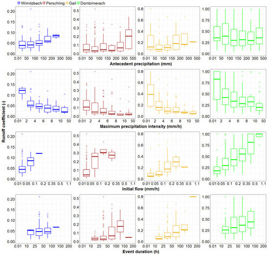 The comparison of event precipitation volume (Figure 5) indicates that the majority (more than 75%) of event precipitation volume is less than 50 mm in all catchments. To explore the differences in runoff response for similar precipitation events in all catchments (i.e., events precipitation less than 50 mm), Figure 6, Figure 7 and Figure 8 show the change of runoff characteristics with changing antecedent precipitation, maximum precipitation intensity, initial flow, and event duration. The results in Figure 6 indicate that the antecedent precipitation is a poor indicator of the runoff coefficient. An increase of antecedent precipitation is not related to a significant rise in Rc. Interestingly, maximum precipitation is inversely associated with runoff coefficients. The Rc tends to be larger for events with smaller maximum precipitation intensity and vice versa. The most explanatory characteristic is the initial flow before the runoff event. The larger the initial flow is, the larger the runoff coefficient is observed in all catchments. In Karstic (Gail) and Flysch (Perschling) catchments, the Rc tends to increase with the increasing duration of runoff events.