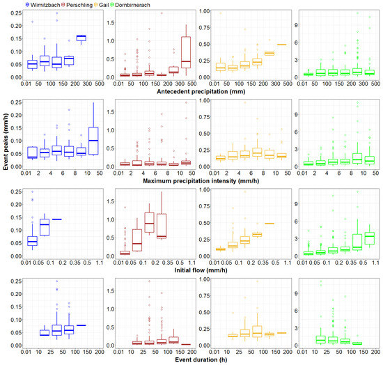 Precipitation characteristics of the analyzed runoff events are evaluated in Figure 5. The statistical evaluation of the distributions of selected event characteristics shows that event precipitation volume and maximum intensities do not differ much between the four analyzed catchments. The medians of event precipitation volume of four catchments vary between 19 and 28 mm, and for Dornbirnerach, the median is someawhat the largest of 28 mm. The event precipitation volume follows the seasonality of precipitation, and it is larger in May and June and lowers in the winter months. An exception is Gail, where the largest precipitation events are observed in November. The maximum precipitation intensity during runoff events is similar in all catchments, while the median varies between 4.9 and 5.8 mm/h. The precipitation intensities are larger in the summer months, and the largest intensities (exceeding 10 mm/h) are observed in Dornbirnerach in July and August. The most noticeable difference is observed for the antecedent 30-days precipitation. This characteristic is used as an indicator of catchment wetness before the runoff events. The analysis indicates that Dornbirnerach is significantly wetter than the other catchments, and the median of antecedent precipitation is about 189 mm, which is more than 100 mm larger than in Perschling or Wimitzbach. The antecedent precipitation is the largest in the summer months and follows the seasonality of the precipitation regime in Austria.