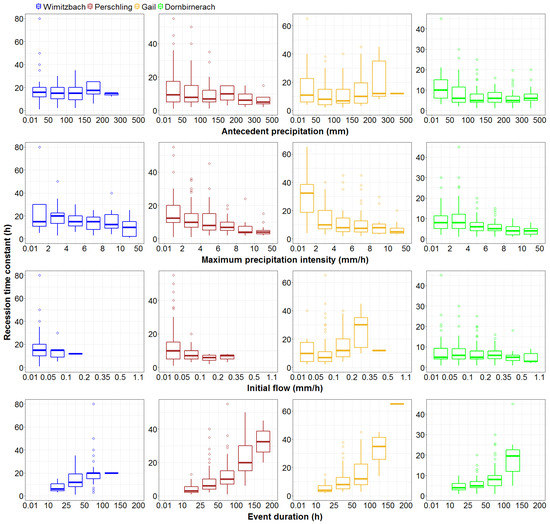 The variability of the recession time constant is presented in Figure 8. Tc is not related to antecedent precipitation, but it decreases with increasing precipitation intensity. An exception is Wimitzbach, which has a large proportion of deep interflow processes. In Wimitzbach, the Tc is not heavily related to the change of maximum precipitation intensity. The initial flow is not associated with the variability of Tc in most of the catchments. Only in Karstic (Gail) catchment, Tc tends to increase with the increasing initial flow before the event. The most apparent pattern is found for the event duration, where for increasing event duration also Tc tends to increase.