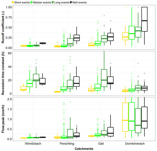 Variability of runoff coefficient, recession time constant, and event peaks for four types of runoff events. The type of runoff event is defined by its duration, i.e., short (duration less than 24 h), medium (duration between 24 and 72 h), long (duration more than 72 h). Events with the contribution of snowmelt are classified as melt events.