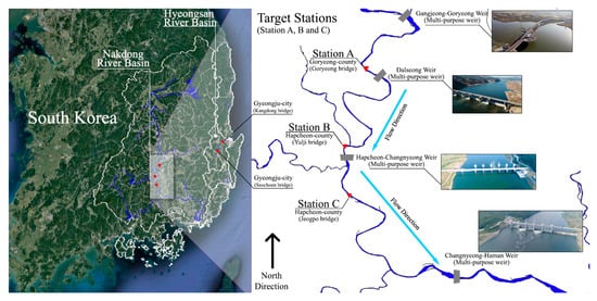 The target of the study are the three hydrological stations—Goryeong County (Goryeong bridge), referred to as station A, Hapcheon County (Yulji bridge), referred to as station B, and the main target of runoff reconstruction, Hapcheon County (Jeogpo bridge), referred to as station C—which were constructed in the middle of the main stream of the Nakdong River, as shown in Figure 1. All of them are adjoined and located in the upper to downstream zones along the 40 km river length. From these stations, the water level and runoff series were obtained. During the Four Major Rivers Restoration Project, many hydrological stations were constructed to collect essential data that are used to maintain the multi-purpose weir (dam) in the Nakdong River []. Almost all of them, including the targets of the study, employ automated measuring equipment, such as acoustic Doppler velocity meters (ADVMs) [] to avoid disturbing the flow influence of the weirs. The upper-basin areas of the stations are 14,034, 15,053, and 16,449.6 km2 and the river widths at the stations are approximately 150 m, 350 m, and 550 m, respectively. The runoff amount at the median water level is 79.2, 93.4, and 101.0 m3/s for each station from 2014 onwards. The start year of the observations for each station was February 1968 for station A, February 2006 for station B, and June 1980 for station C. However, flow characteristics were significantly changed by the Four Major Rivers Restoration Project [], which caused the unmatched historical record of runoff from 2012 to the present. Table 1 shows the general flow conditions and changed characteristics before and after the project. Overall, the flow amount of each quantile was approximately increased by 10~20 m3/s, and the kurtosis coefficient, which is highly correlated with the shape of distribution, was also increased. Stations A, B, and C are considered to be very important points due to being: (i) runoff observatories in the middle part of the Nakdong River, (ii) validation points of the inflow amount from the Hwang River, which is one of the main tributaries, and (iii) the official check points for green algal blooms of the Nakdong River []. So, all of them are essential for water resources management, including flood, drought, and water quality. However, station B has abnormal data from 2012 to 2013 that show approximately 3200 m3/s for the average runoff amount, despite stations A and C showing averages of 208 m3/s and 259 m3/s, respectively. So, the historical runoff record of 2012 to 2013 is insignificant and the official approval of hydrological data for the target stations has not been implemented due to the runoff consistency problem. The daily runoff series data of the three hydrological stations and their properties were obtained from the Water Resources Management Information System [].