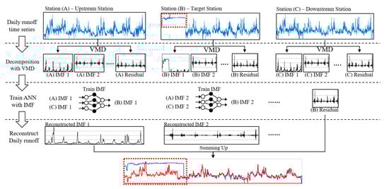 Finally, Figure 2 shows the overall framework and process for the runoff reconstruction model with three stages: (i) decomposing the runoff series into IMFs based on the VMD technique, (ii) training and establishing an ANN model to reconstruct each IMF using adjacent stations, and (iii) runoff reconstruction by summing up reconstructed IMFs and residuals.