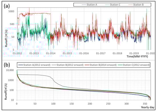 Figure 3 shows the obtained runoff time series from 2012 to 2019 and the abnormal data from 2012 to 2013 in station B. All of stations have a similar trend in the flow duration curve (FDC), except station B, including 2012 to 2013. It is assumed to have interference and instability during the period of stabilization. In fact, several hydrological stations in the Nakdong River showed the same problem. There are eight hydraulic structures (multi-purpose weirs) in the main stream, and the flow characteristic or correlation between each hydrological station is disturbed. For example, adjacent hydrological stations in the Hyeongsan River—specifically, Gyeongju City (Seochoen bridge) and Gyeongju City (Kangdong large bridge) in Figure 1—showed 0.94 for the correlation coefficient from 2012 to 2019 (See Figure 4a). In stark contrast, stations A and B (see Figure 4b) and B and C showed only about 0.49 and 0.55 for the correlation coefficient in the same period despite similar distances in between stations (km) and times of concentrations [].
