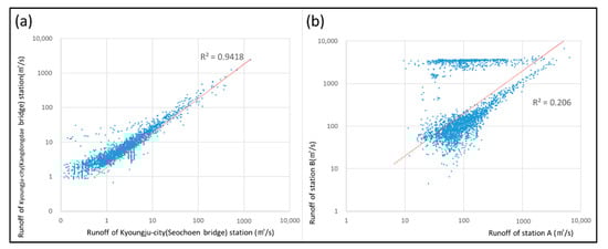 Scatter plot of historical daily runoff record (2012 to 2019): (a) scatter plot of runoff in the Hyeongsan River (Seochoen bridge and Kangdong large bridge at Gyeongju City in Figure 1), (b) scatter plot of stations A and B in the Nakdong River.
