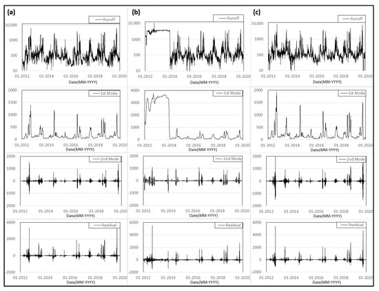 Decomposed result with variational mode decomposition (VMD): (a) station A, (b) station B, (c) station C, and each runoff series decomposed into two modes and residual mode.