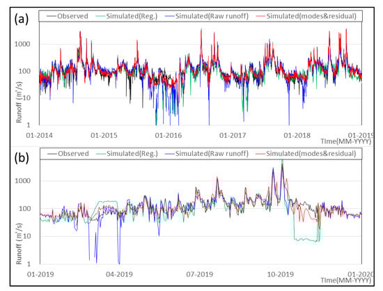 Simulated result with two ANN models: (a) learning periods, (b) validation periods; black line indicates observed runoff, green line indicates simulated runoff with multiple regression, blue line indicates simulated runoff with raw runoff, and red line indicates simulated runoff with modes and residual.